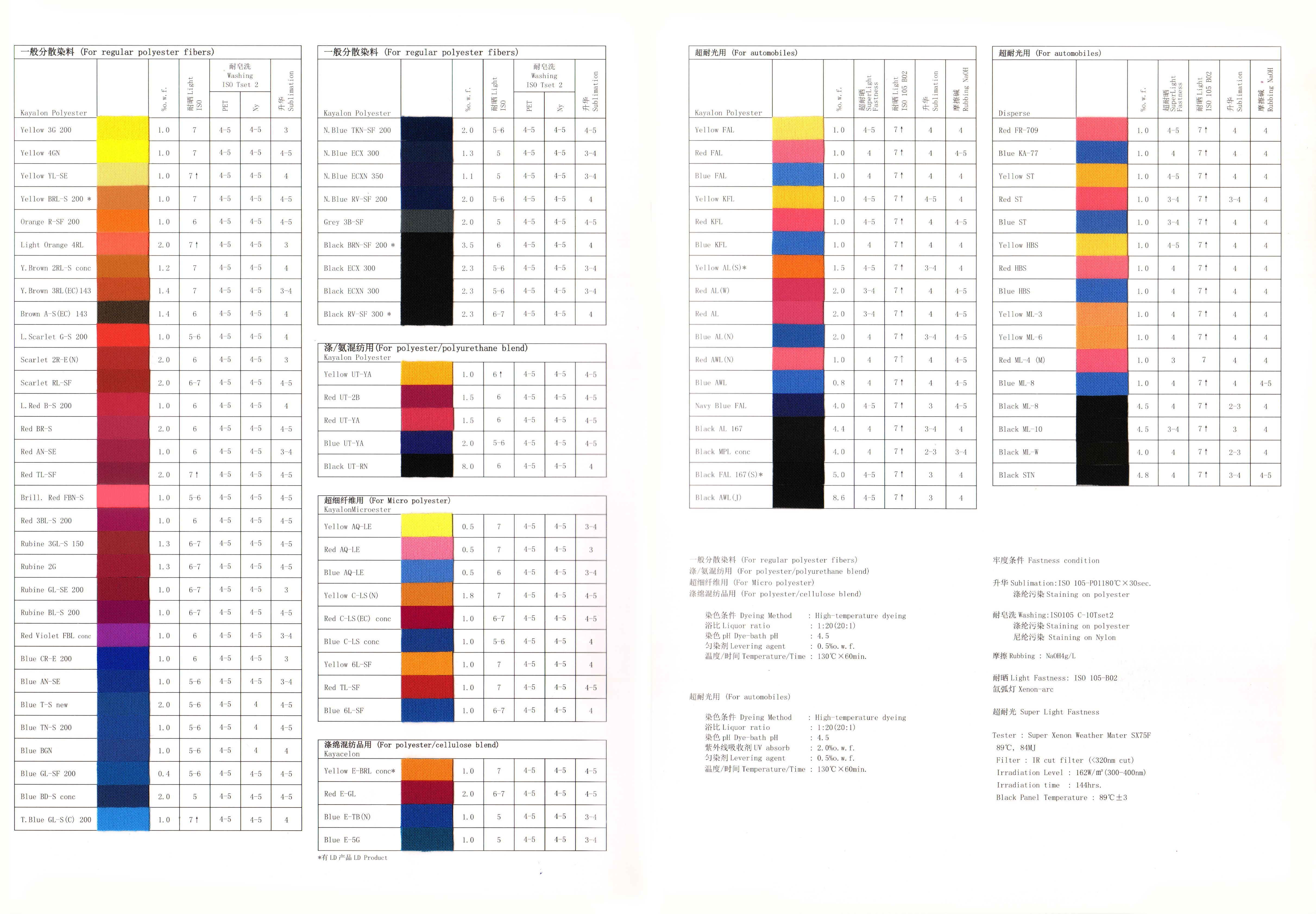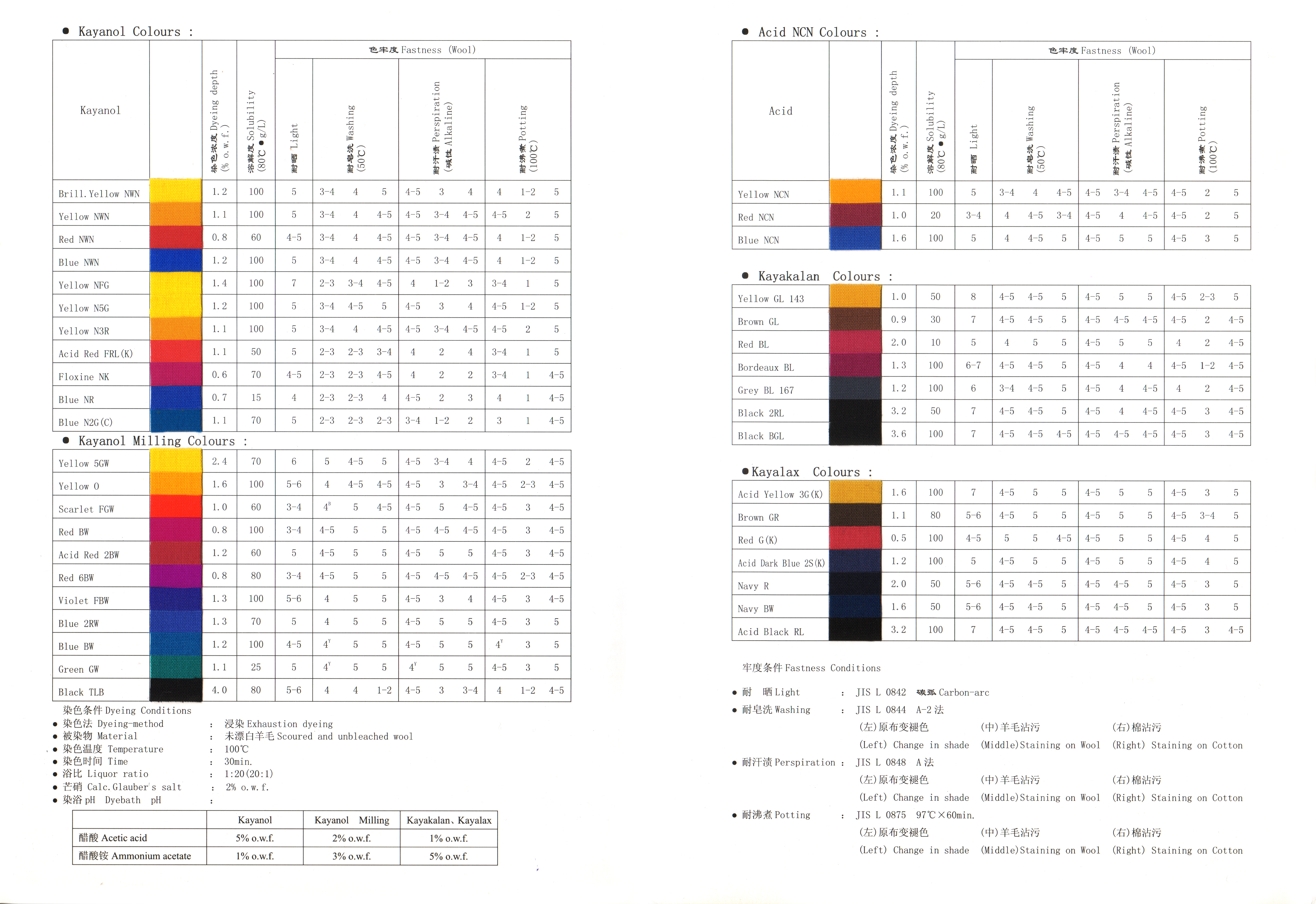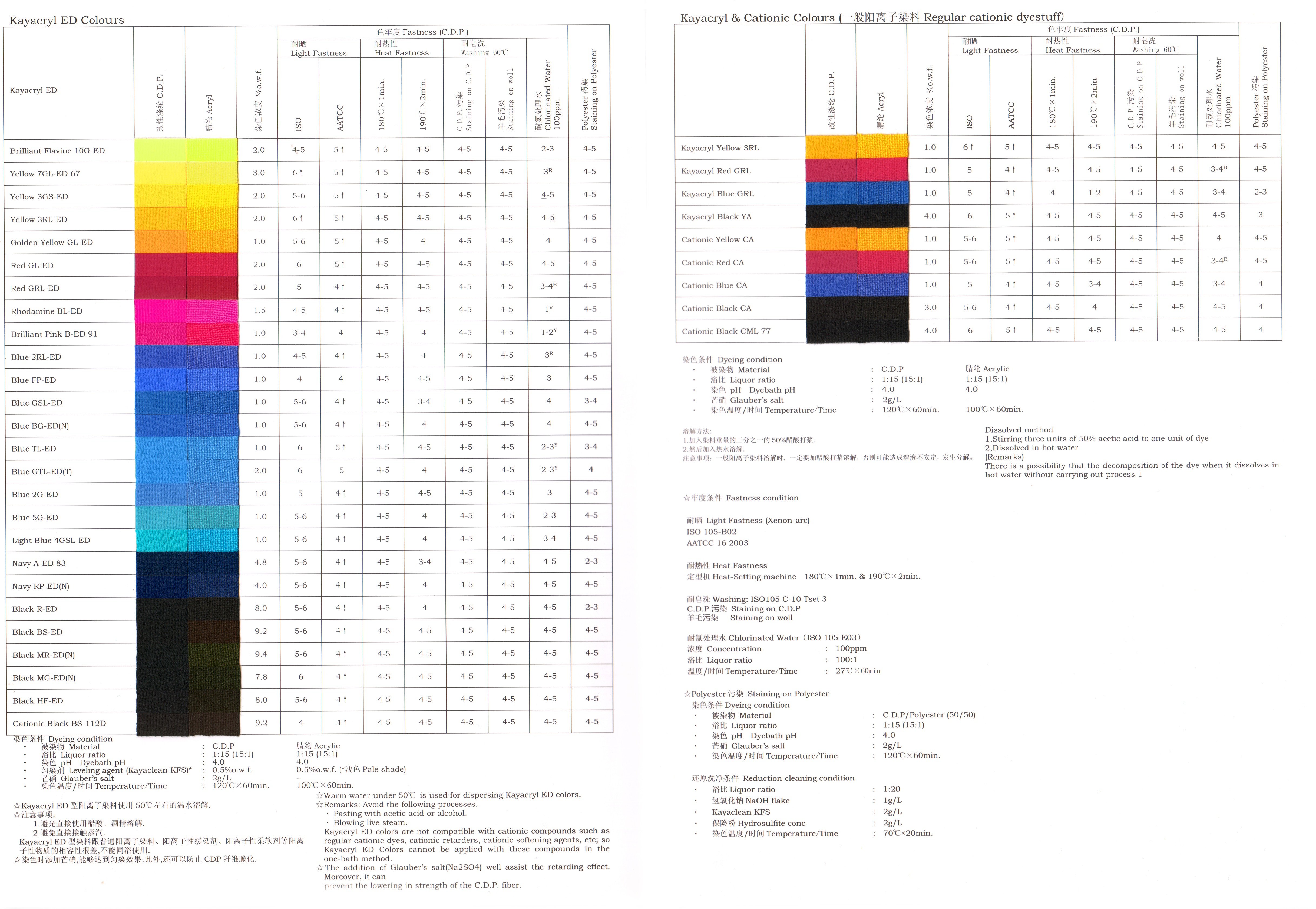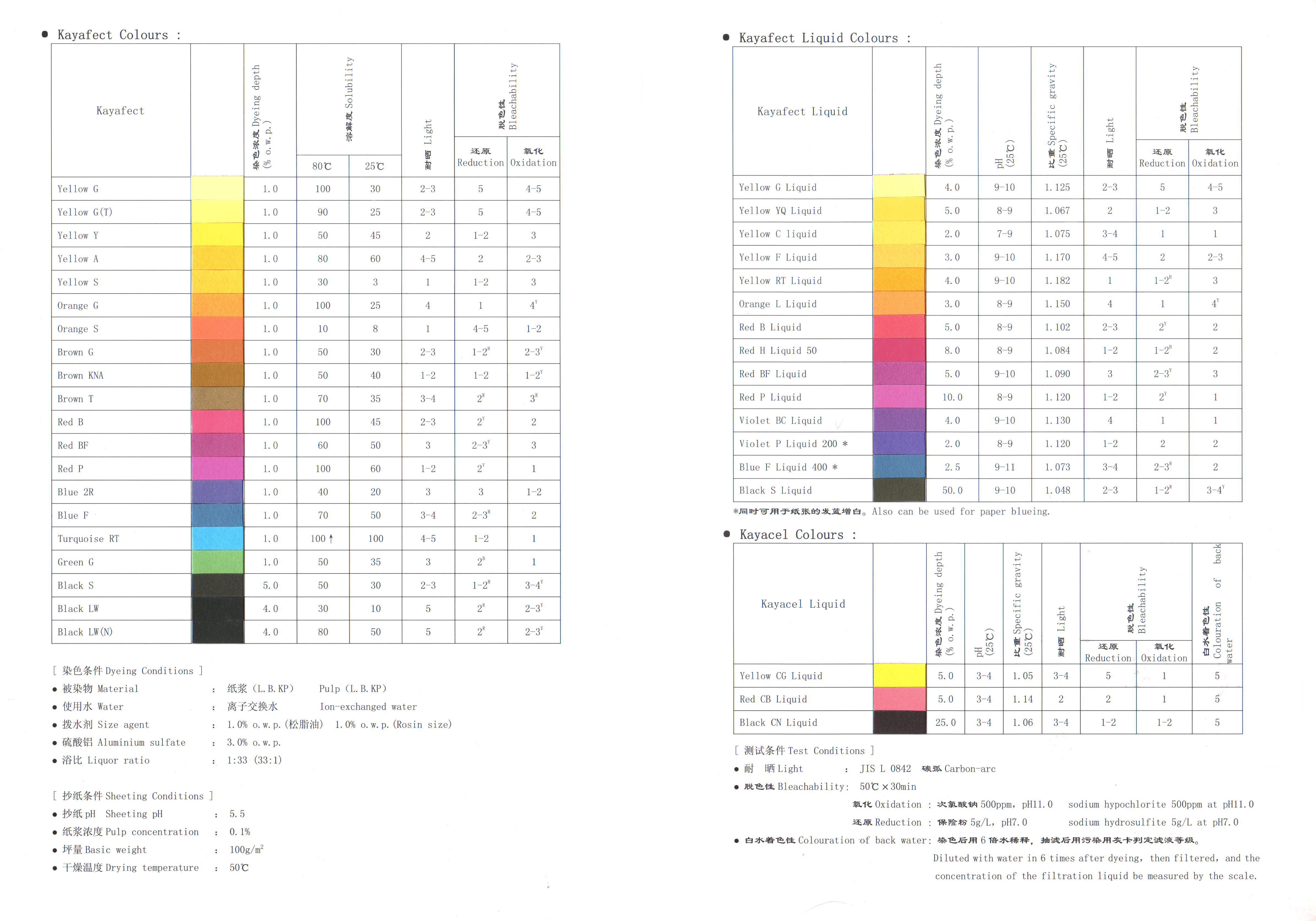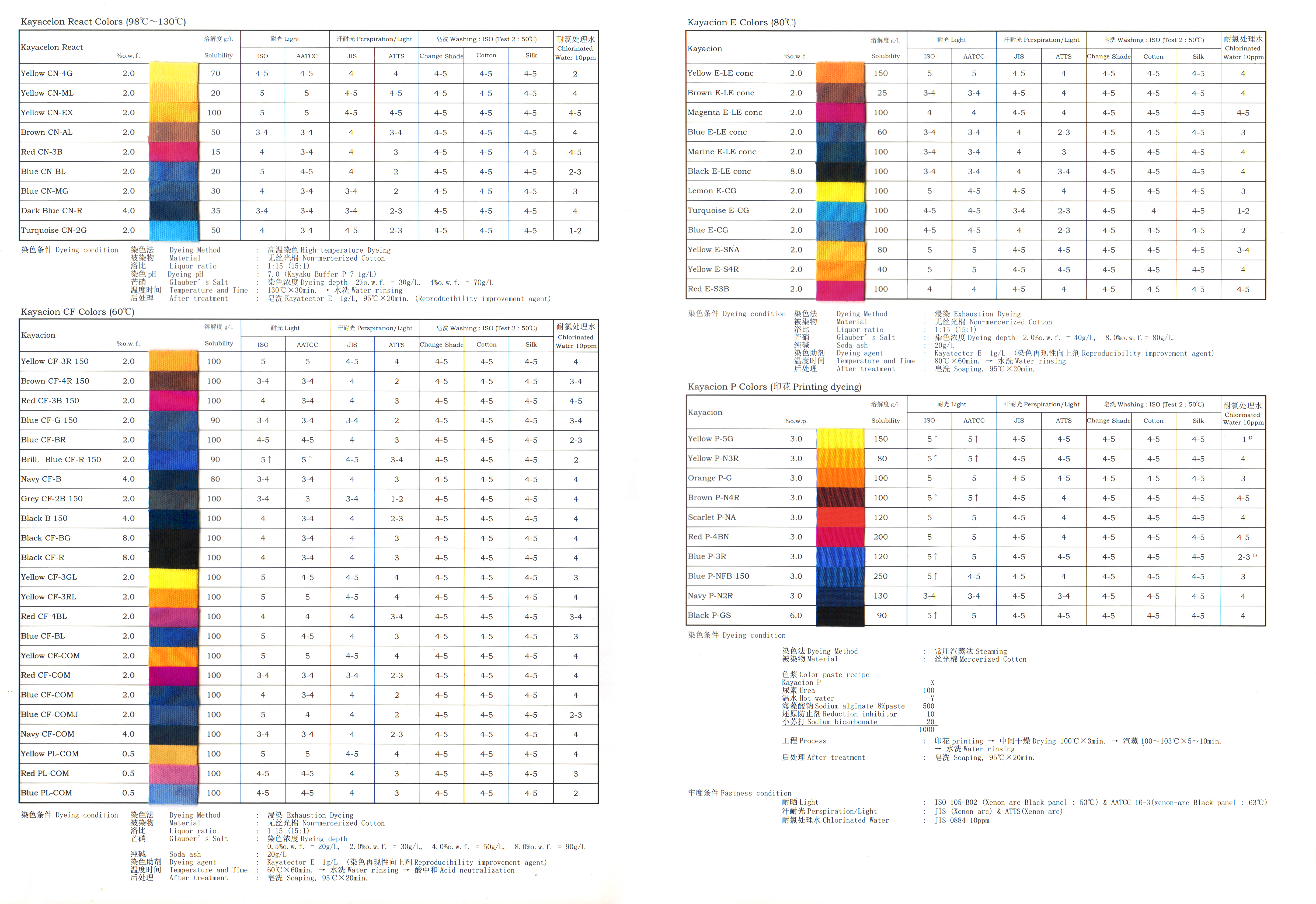 日本化药-主营业务:阳离子染料Cationic Dyes,分散染料Disperse Dyes,活性染料 Reactive Dyes,酸性染料 Acid Dyes, 纸用直接染料 Direct dyes for pulp & paper